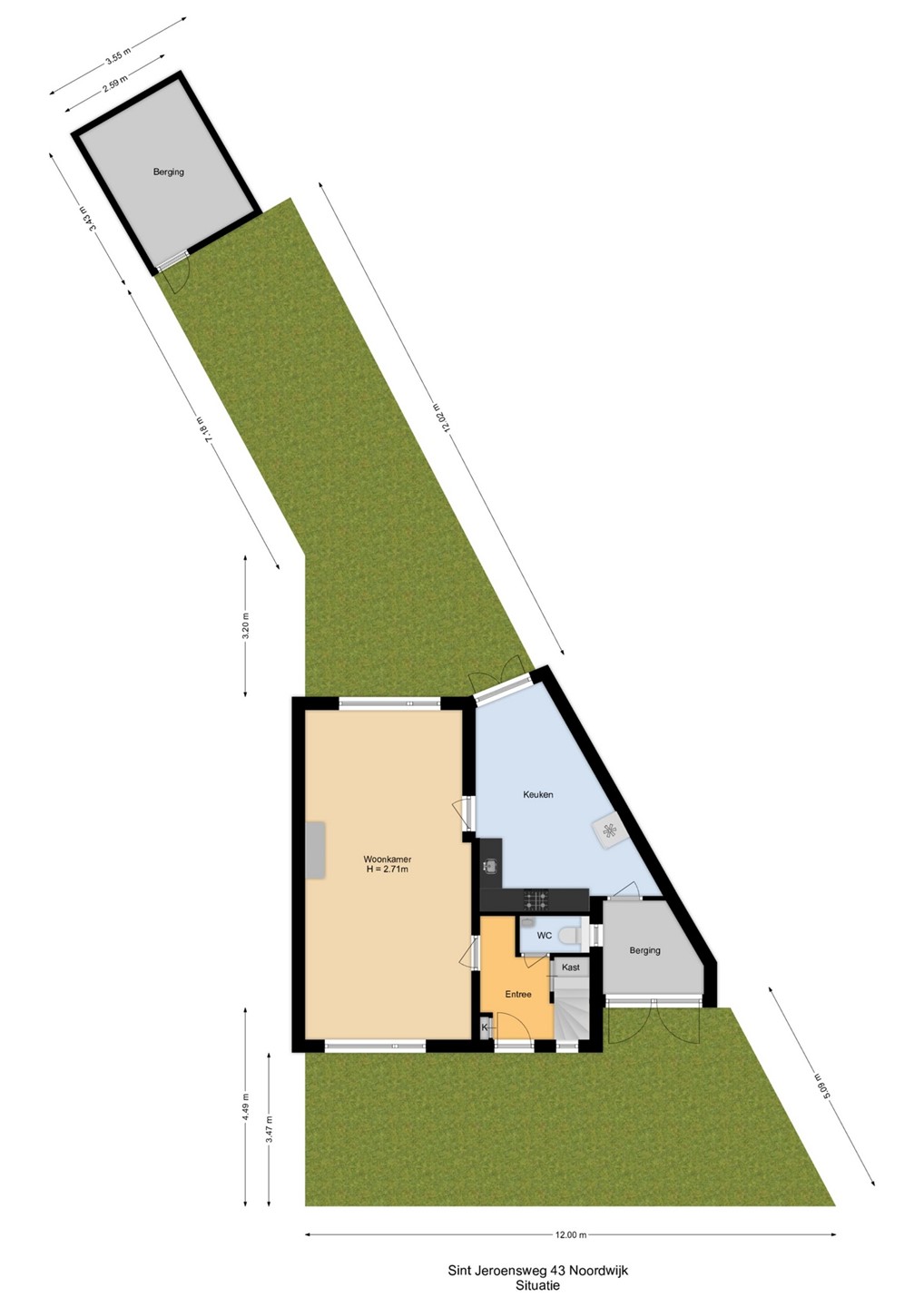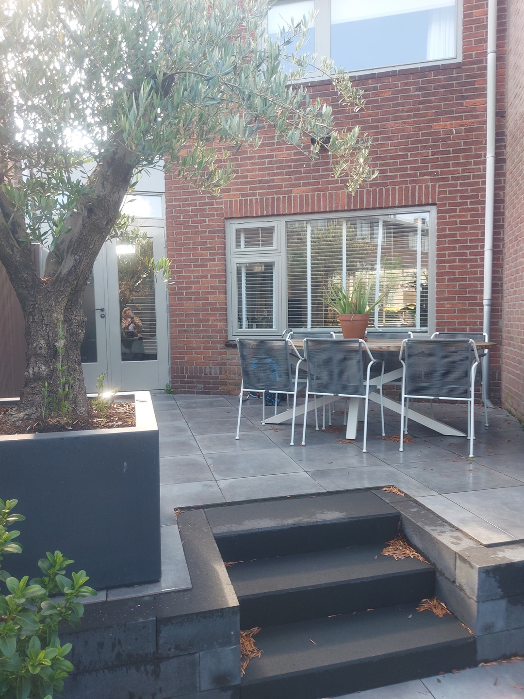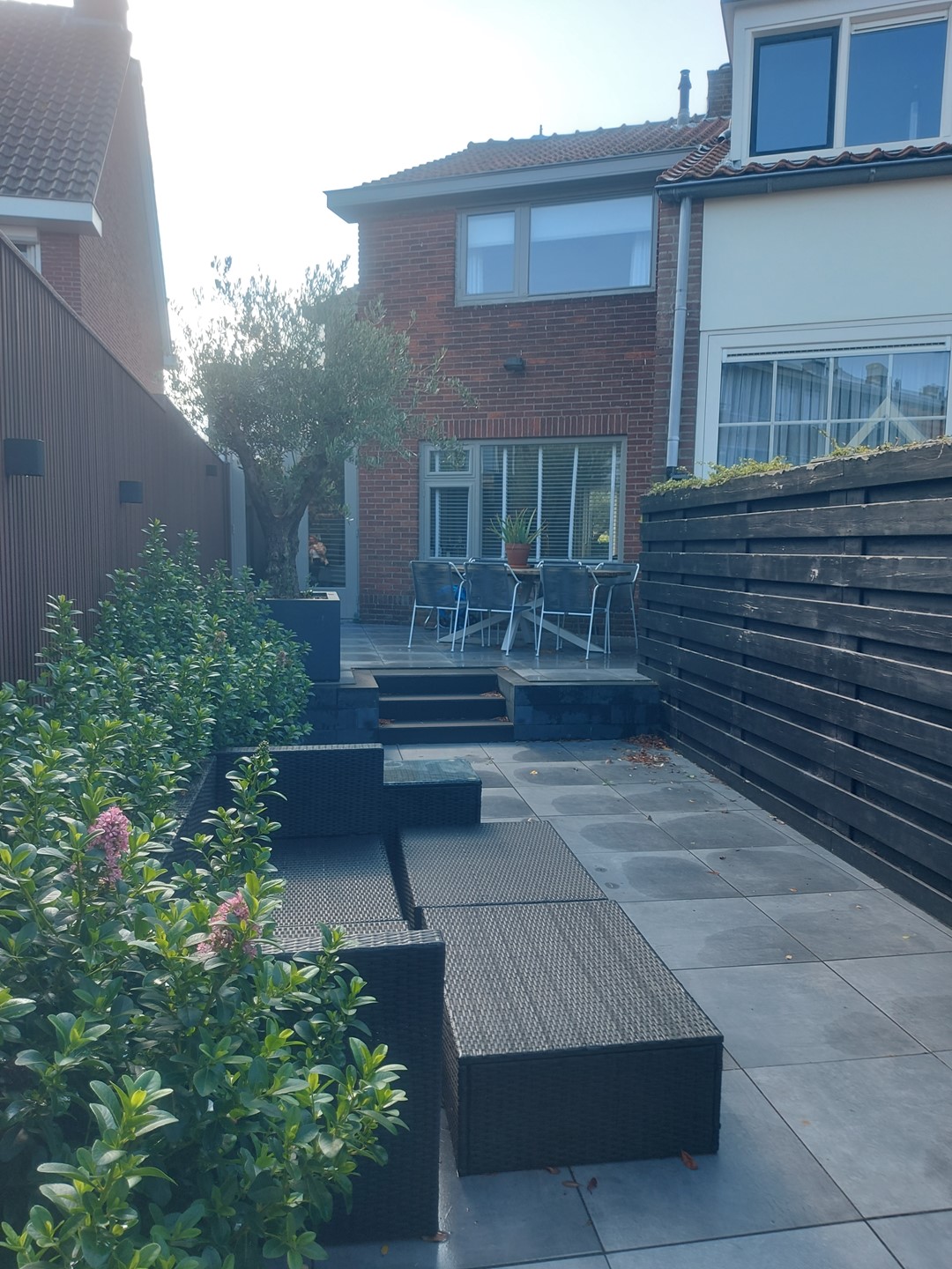 De openslaande deuren geven toegang tot de diepe achtertuin (ca. 12 m) op het noordwesten. Achterin de achtertuin bevindt zich een ruime vrijstaande berging.